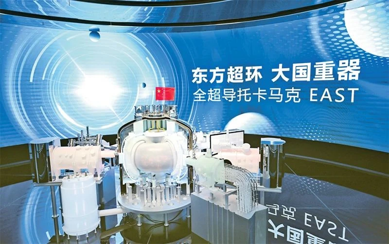 2025年1月,我国有“人造太阳”之称的全超导托卡马克核聚变实验装置(EAST)在安徽合肥创造新的世界纪录,首次完成1亿摄氏度1000秒“高质量燃烧”,标志我国聚变能源研究实现从基础科学向工程实践的重大跨越。图为7月1日,在聚变创新展览馆拍摄的全超导托卡马克核聚变实验装置(EAST)模型。 新华社记者 张铖/摄