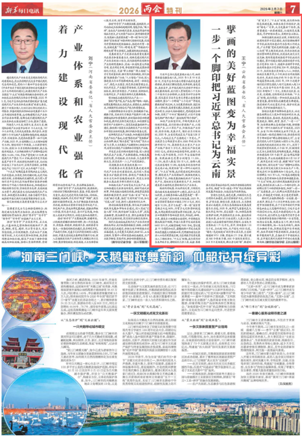 3月7日,《新华每日电讯》刊发云南省委书记、省人大常委会主任王宁署名文章《一步一个脚印把习近平总书记为云南擘画的美好蓝图变为幸福实景》。
