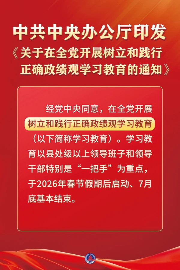 近日,中共中央办公厅印发《关于在全党开展树立和践行正确政绩观学习教育的通知》。本次学习教育以立党为公、为民造福、科学决策、真抓实干为总要求,旨在教育引导各级党组织和党员、干部坚持实事求是、求真务实,为人民出政绩、以实干出政绩。 新华社发 钟睿/编制